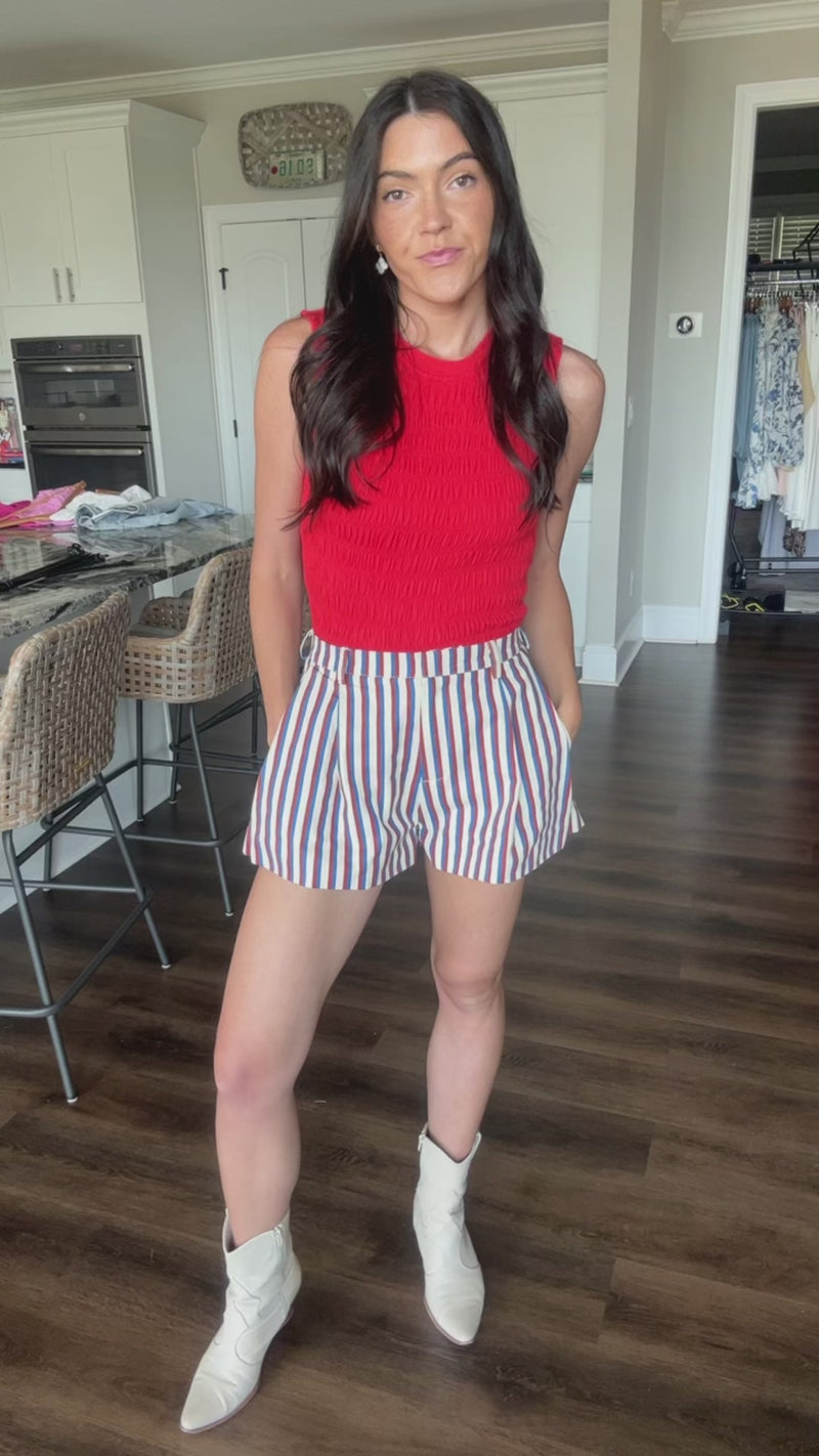 Breezy, bold, and effortlessly chic—the Harbor Days Striped Shorts are your go-to for warm-weather style. Designed with a flattering high waist and wide-leg silhouette, these shorts feature soft pleats in the front for a touch of tailored charm. The classic stripe pattern channels nautical vibes, making them perfect for a Fourth of July cookout, a stroll along the boardwalk, or a night on the town. Pair with your favorite crop top or tucked-in blouse for a look that’s as comfortable as it is striking.