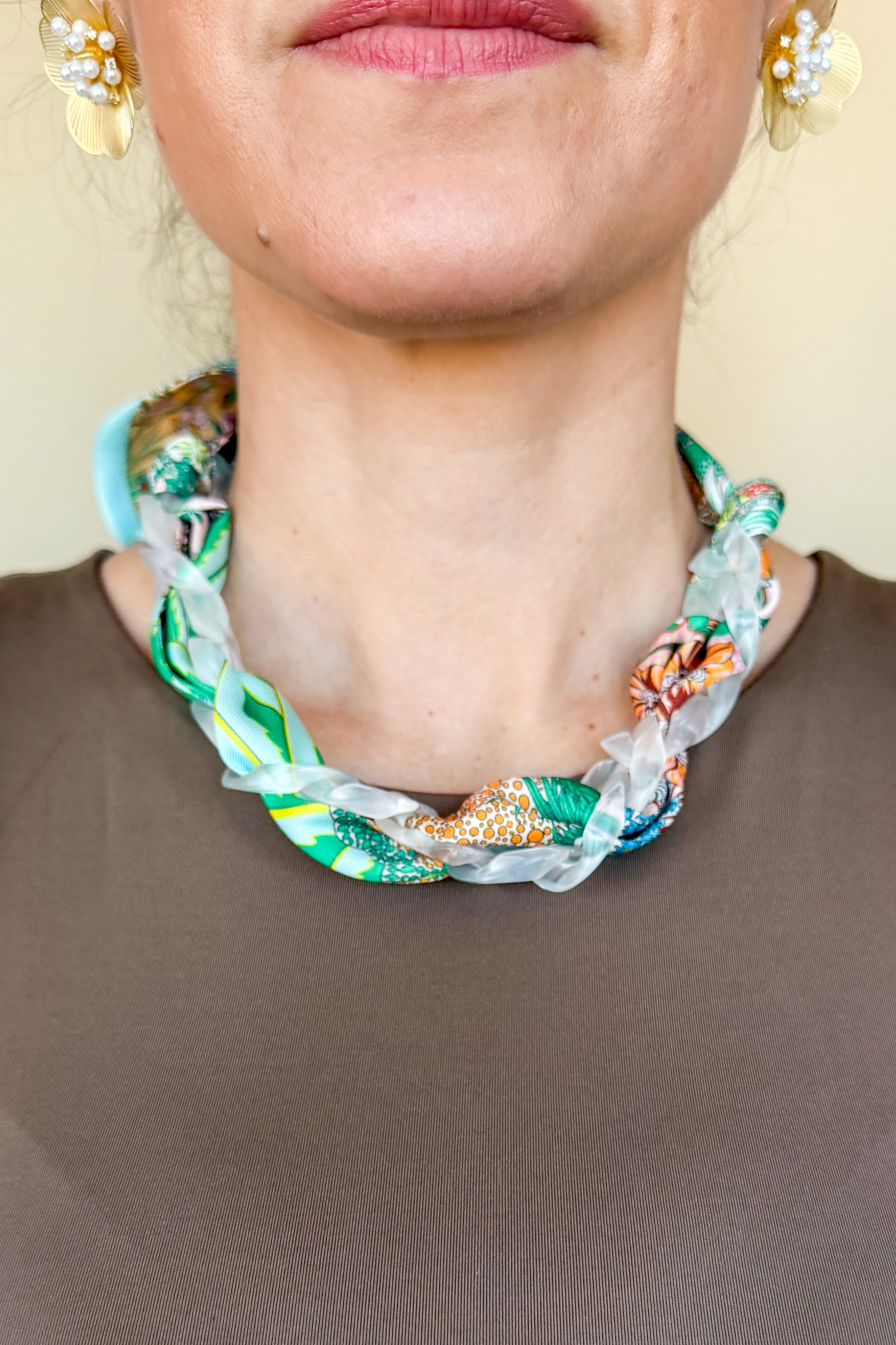 Meet your new favorite spring statement: the scarf necklace, reimagined. Featuring a frosted acrylic chain paired with the softest, dreamiest spring scarf, this piece is equal parts playful and polished. It’s lightweight, eye-catching, and guaranteed to add a pop of happy to every outfit—no styling effort required.