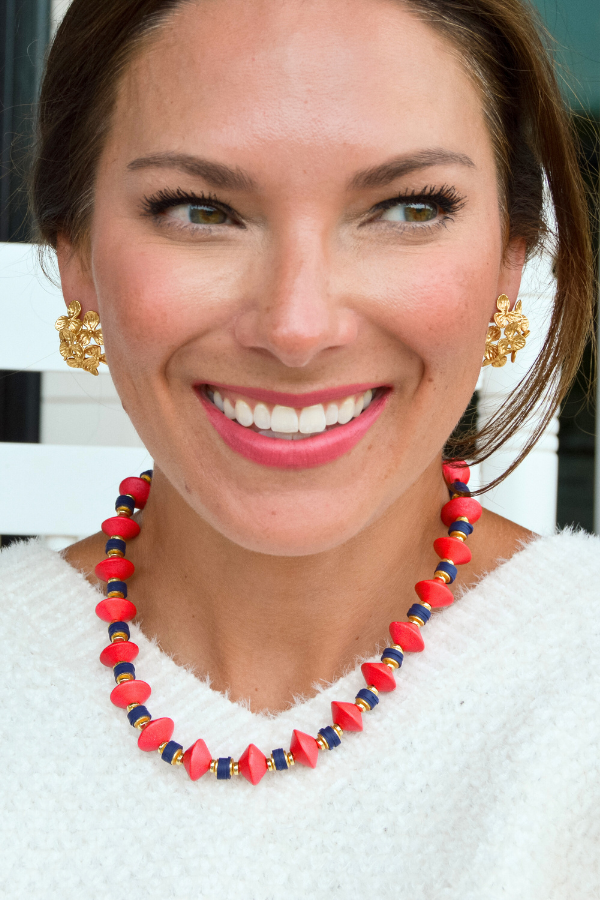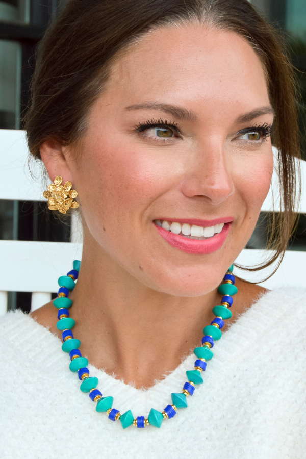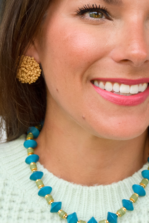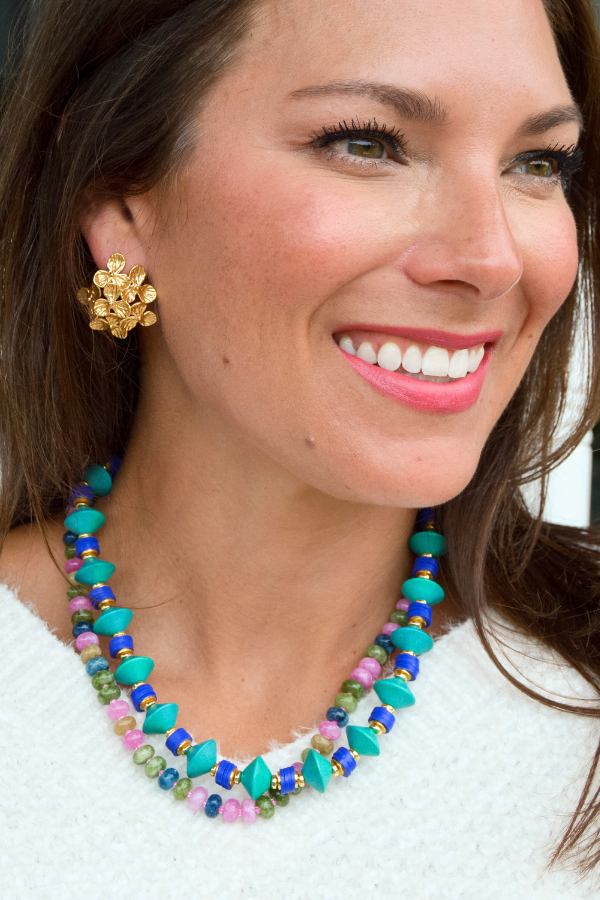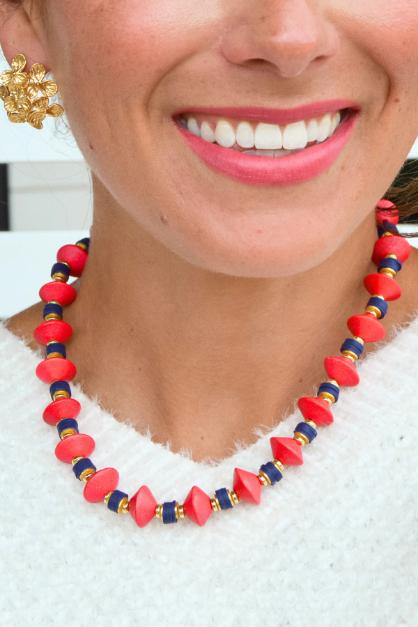 Elevate any outfit with the Maggie Necklace! This stunning piece features a mix of wooden beads and gold accents, plus a 17.5 inch length and 2 inch extender. The bold jewel tones add a touch of elegance to your look. Get ready to stand out and make a statement!