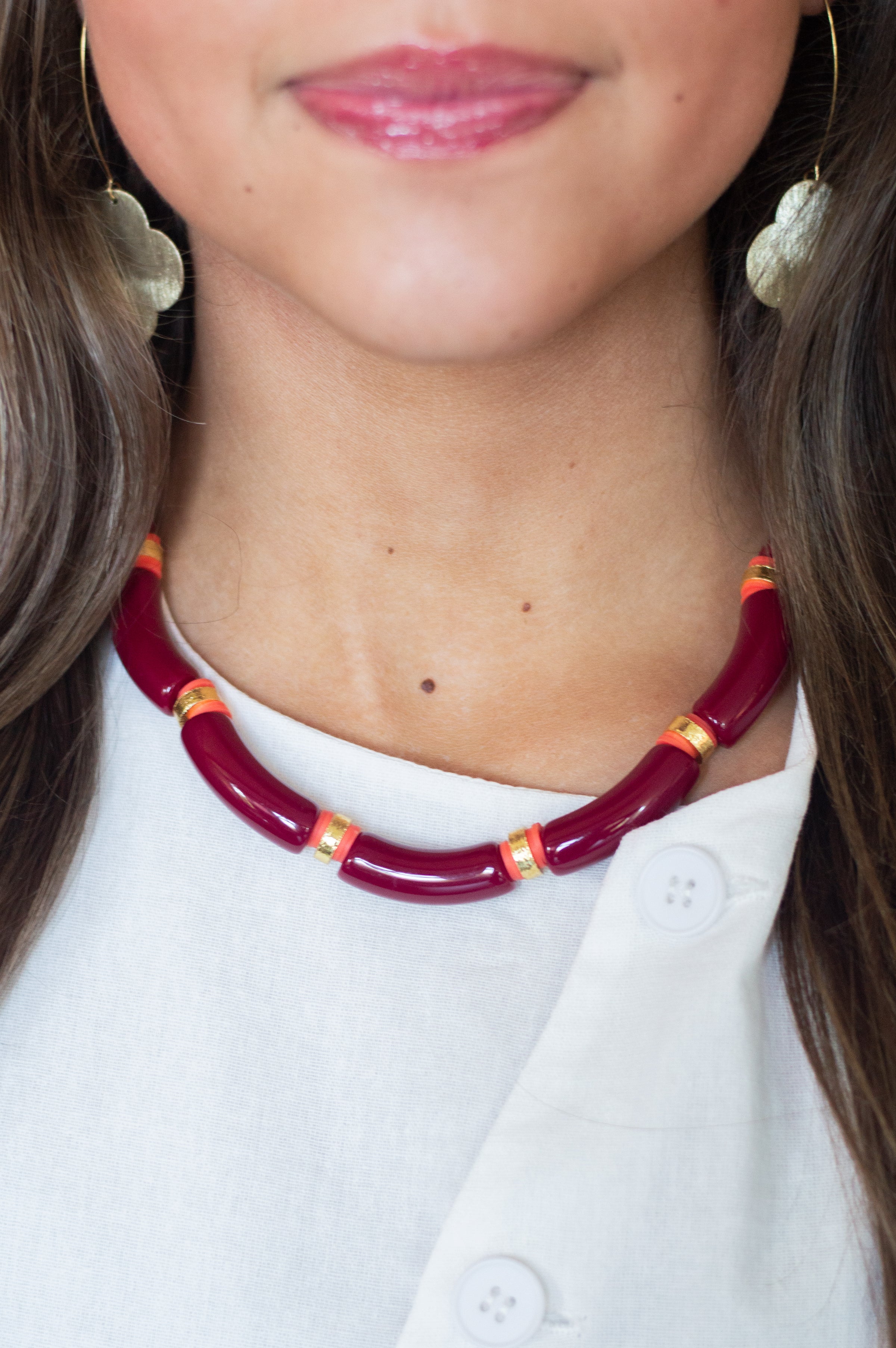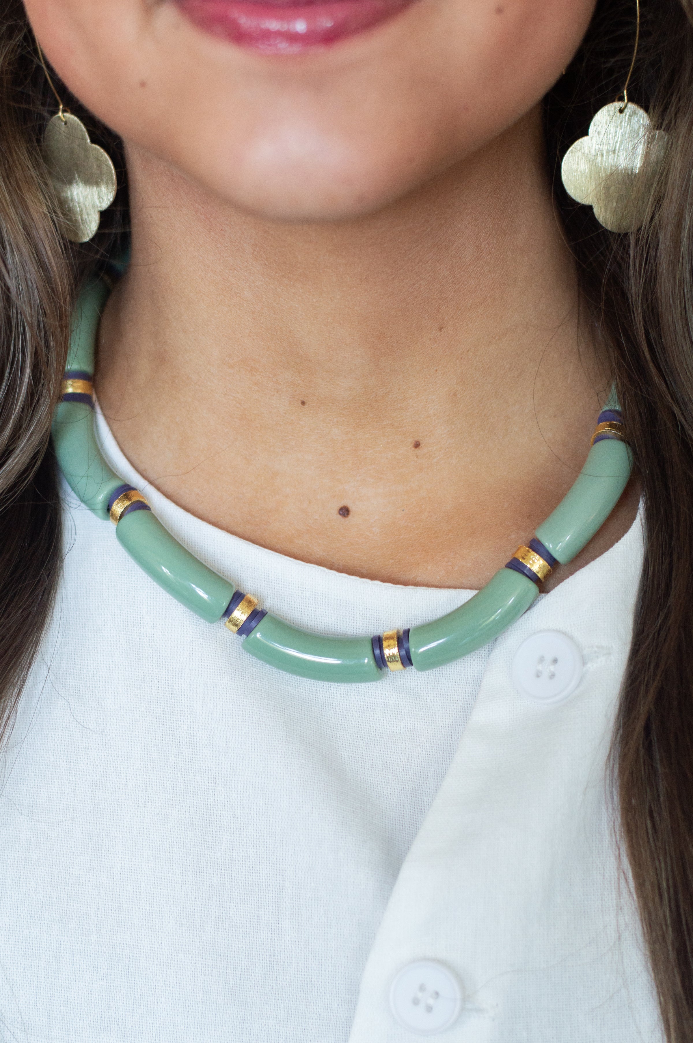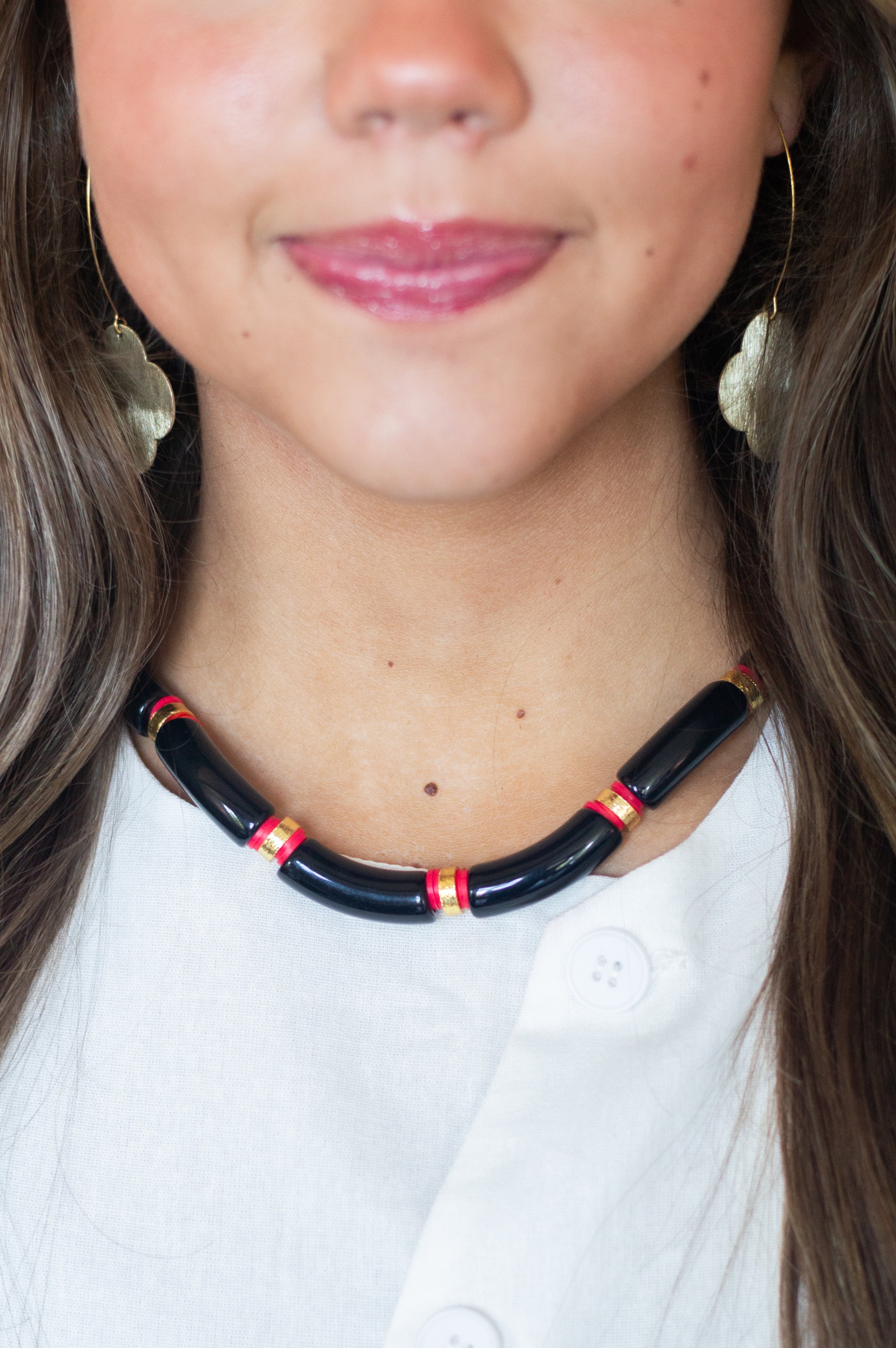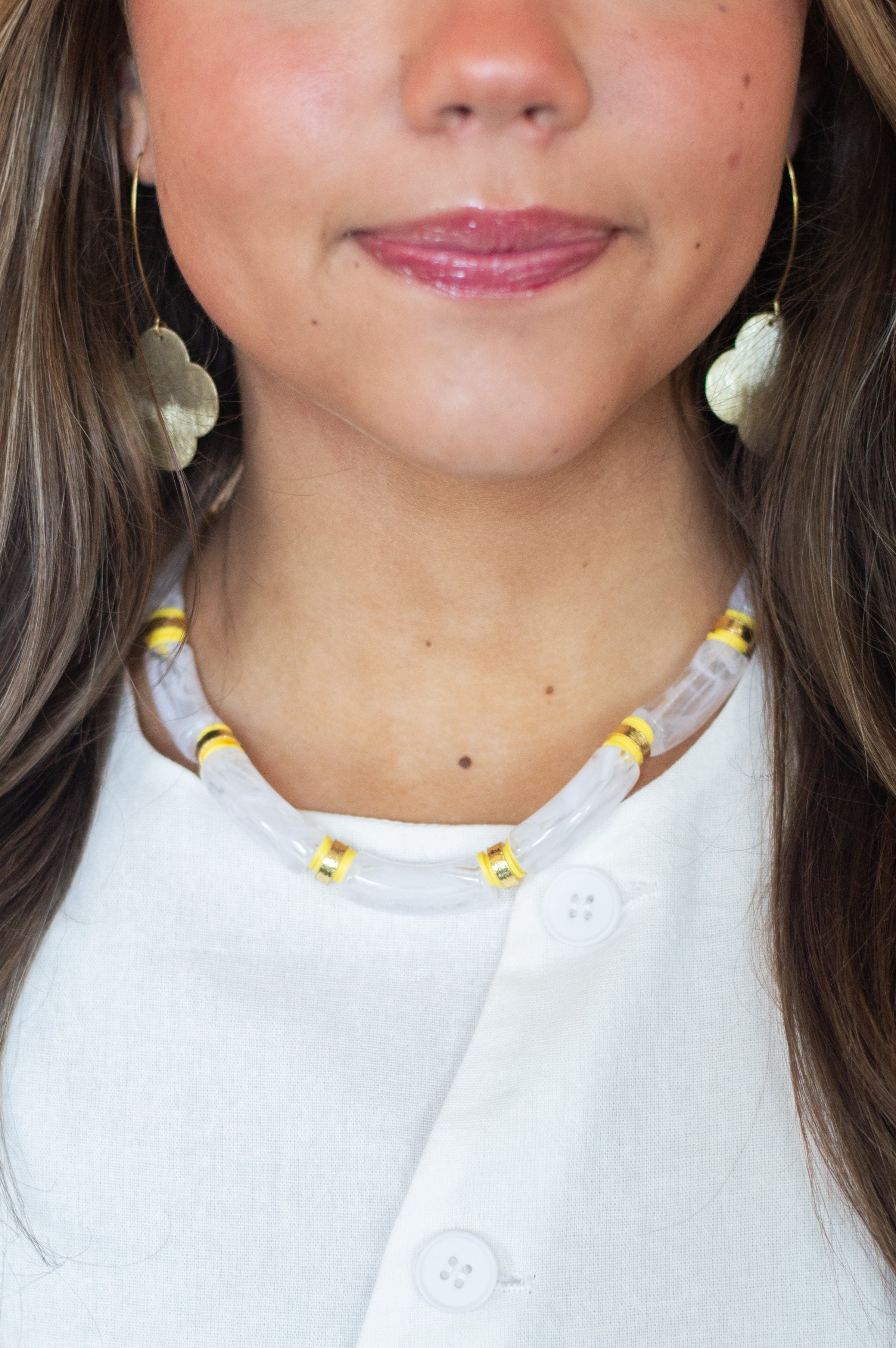 Chunky perfection with a playful edge — This glam necklace brings vibrant acrylic beads to life, accented by colorful clay disc spacers and touches of gold-plated shine. Whether you're repping your team on gameday or turning heads downtown, this standout piece delivers style and spirit. Layer it with our Gold Diana Chain Necklace for an effortlessly elevated look.