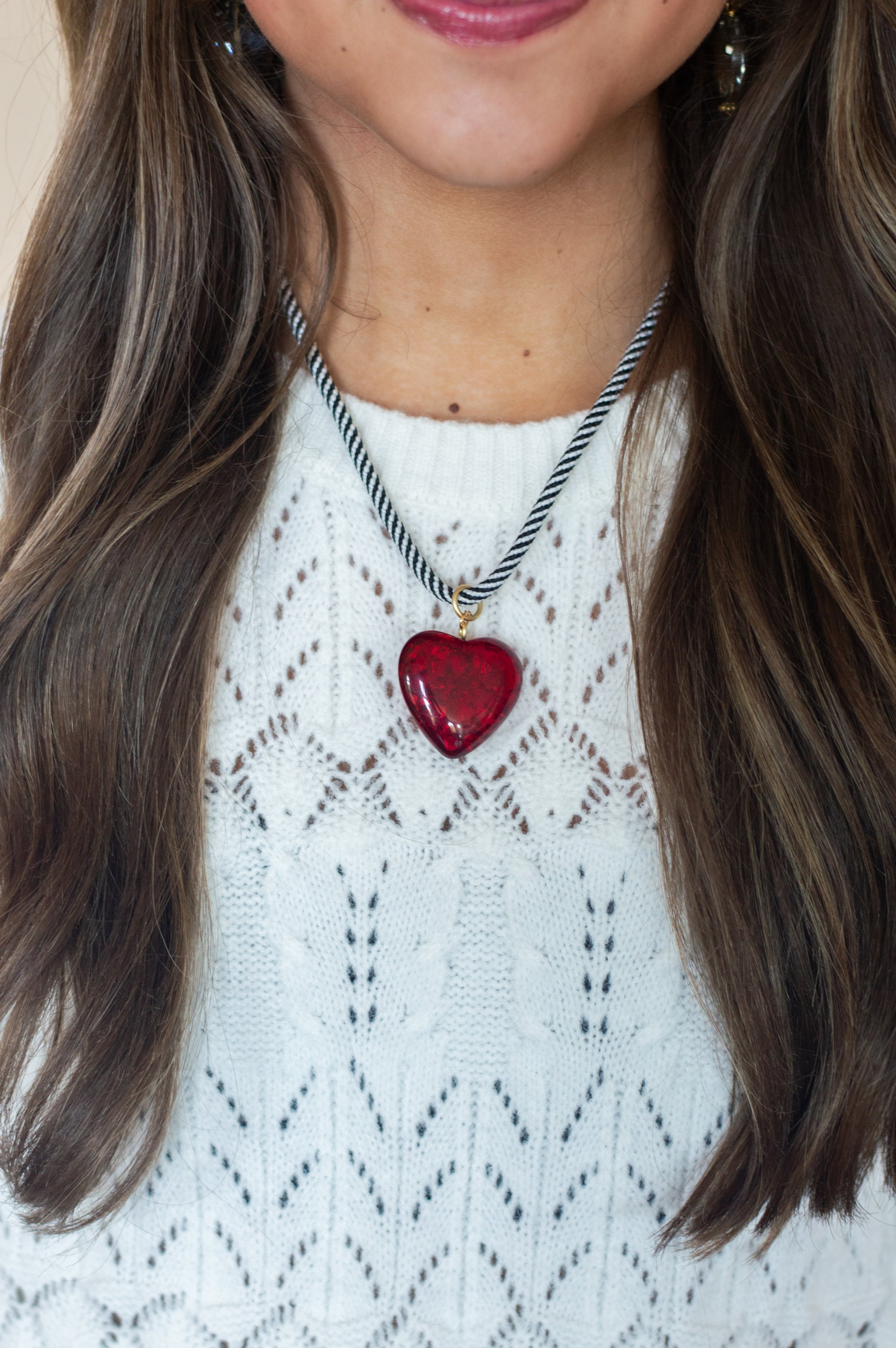 Bold, playful, and full of team spirit—the Sadie Necklace is a gameday essential. Featuring a black and white rope design with a lightweight acrylic red puff heart charm, it’s the perfect outfit-maker for cheering in style. Whether you're tailgating or heading to the stadium, Sadie brings the statement without the weight.
