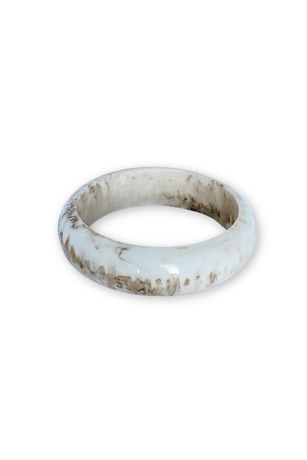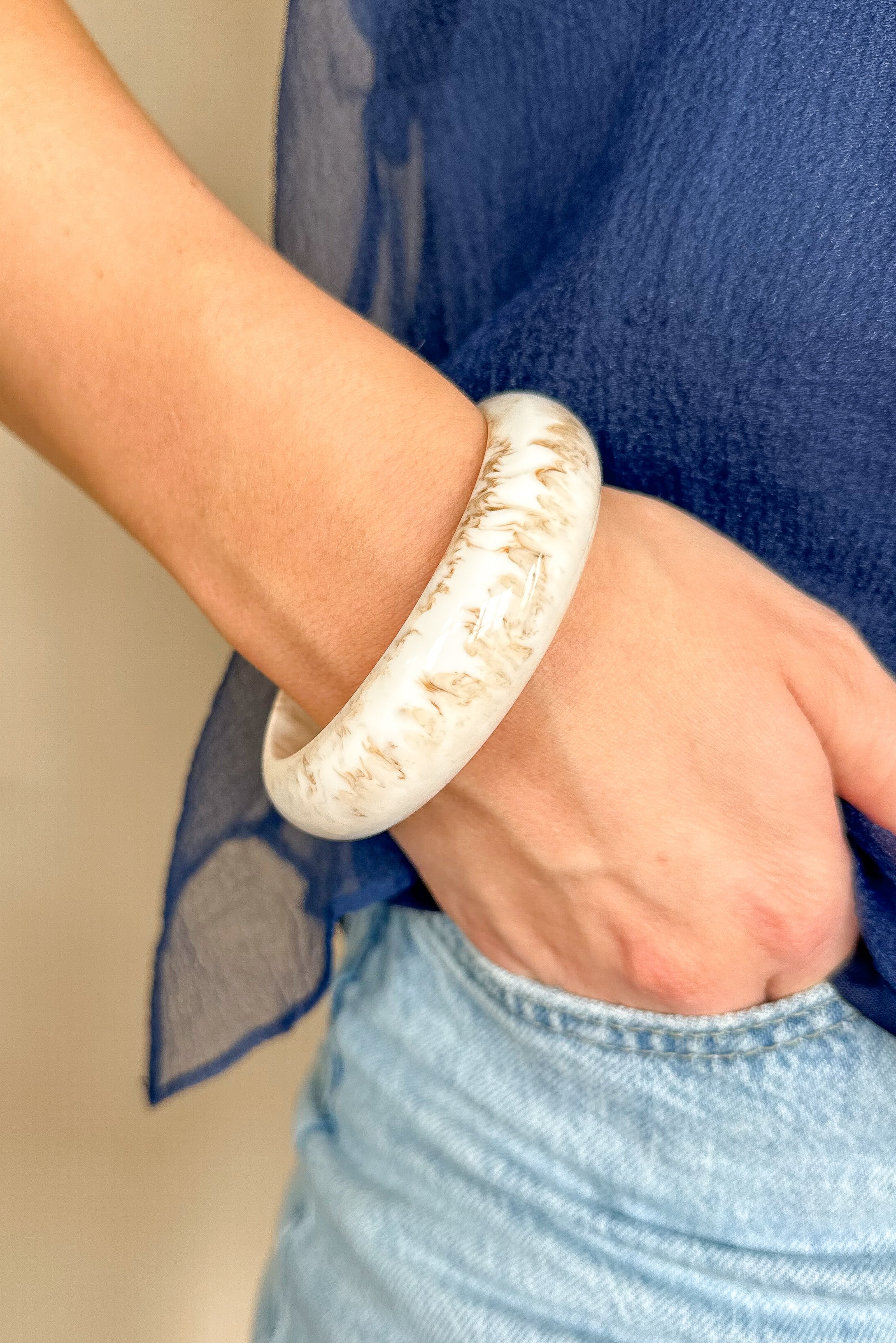 Crafted with a smooth, lightweight resin and a modern marble-inspired swirl, this on-trend bangle slides comfortably onto wrists around size 7. Its glossy finish and unique pattern make it the perfect accessory for stacking or wearing solo.
