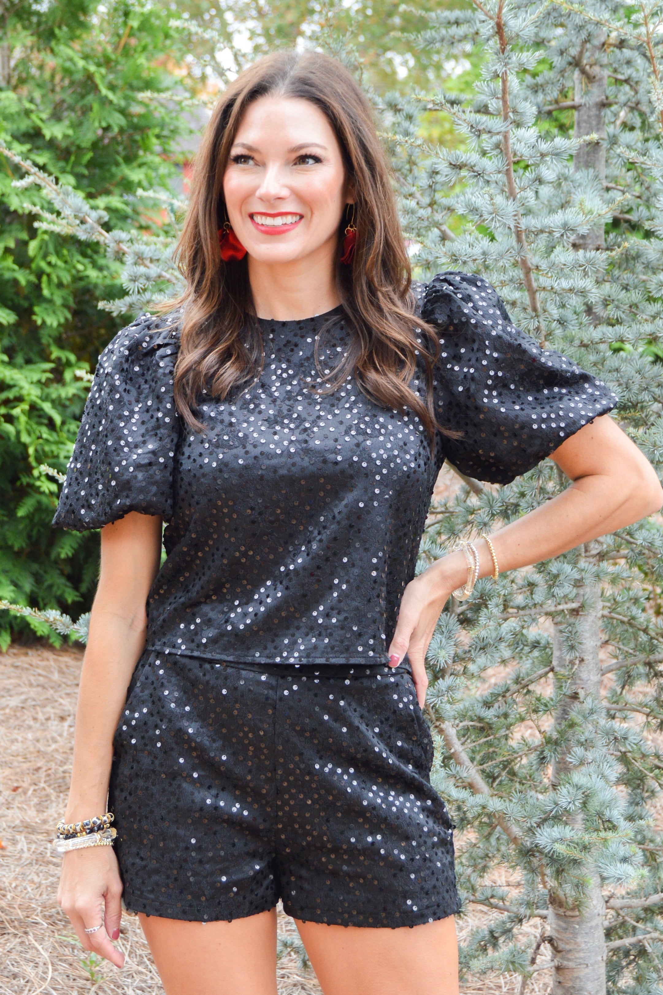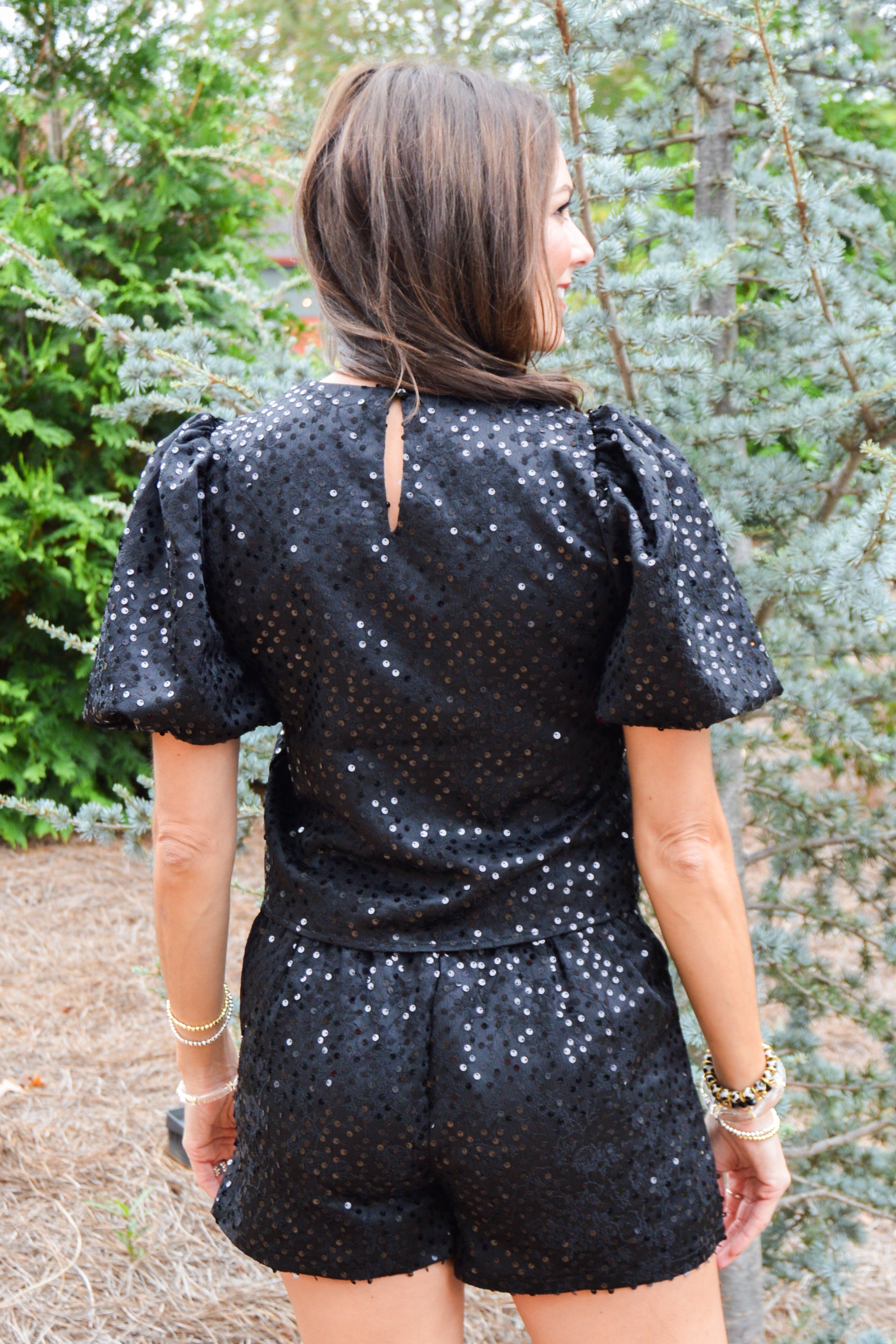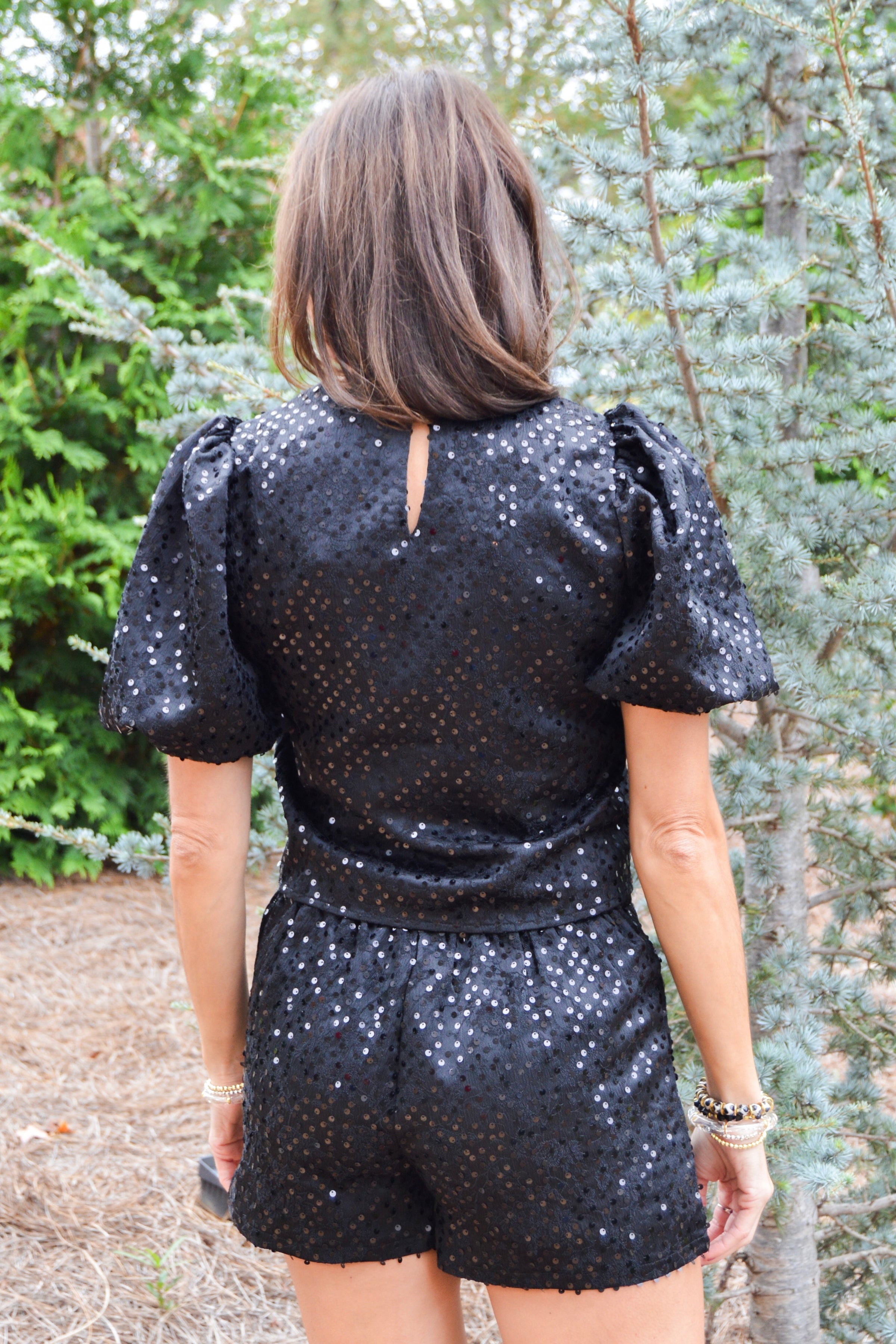 Get ready to sparkle and shine with our Blackout Bling Top! This statement piece features a sequin encrusted round neckline and trendy puff sleeves. The back keyhole with button closures adds a charming touch. Don't forget to complete the look with our matching shorts (sold separately).