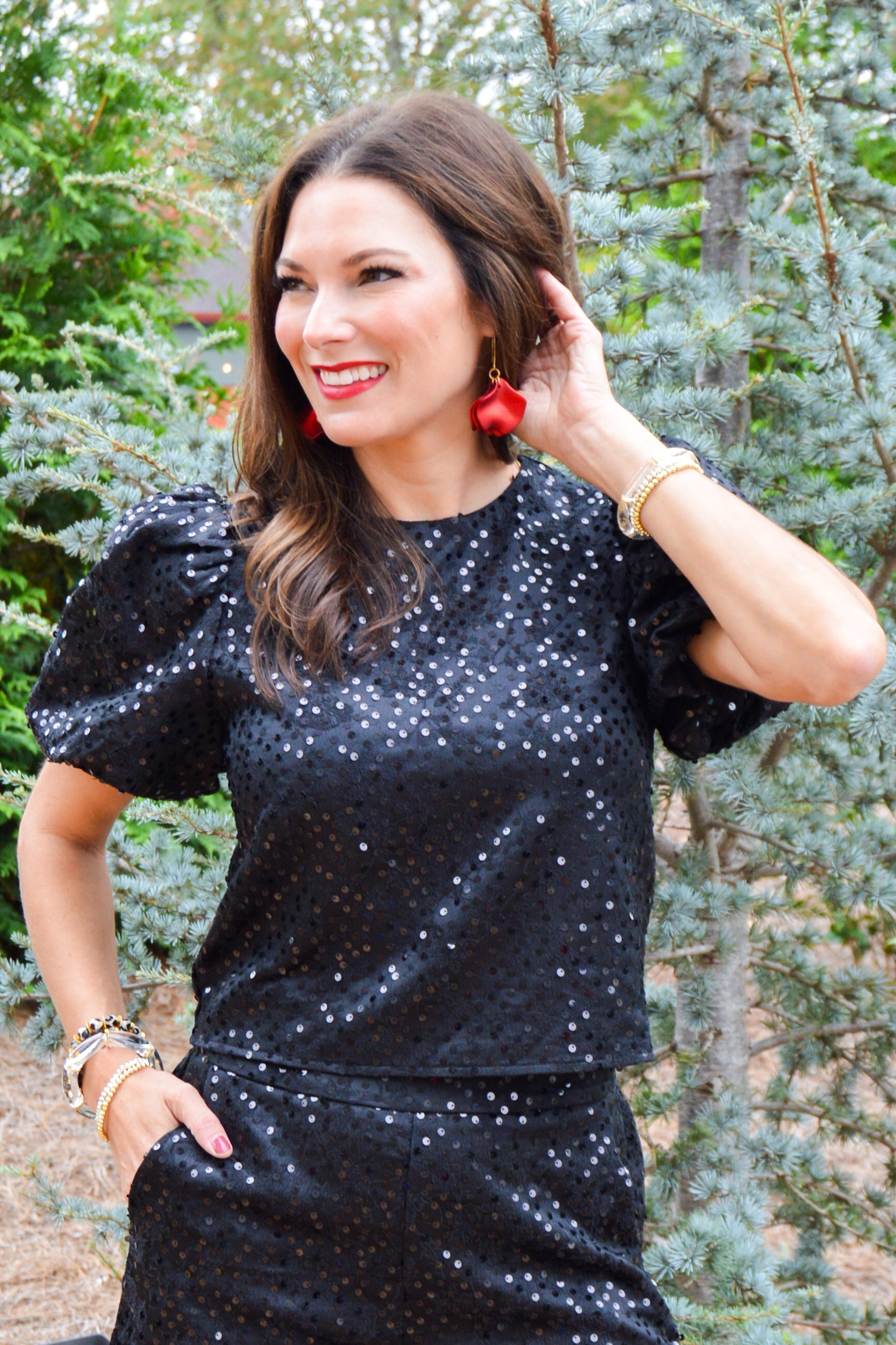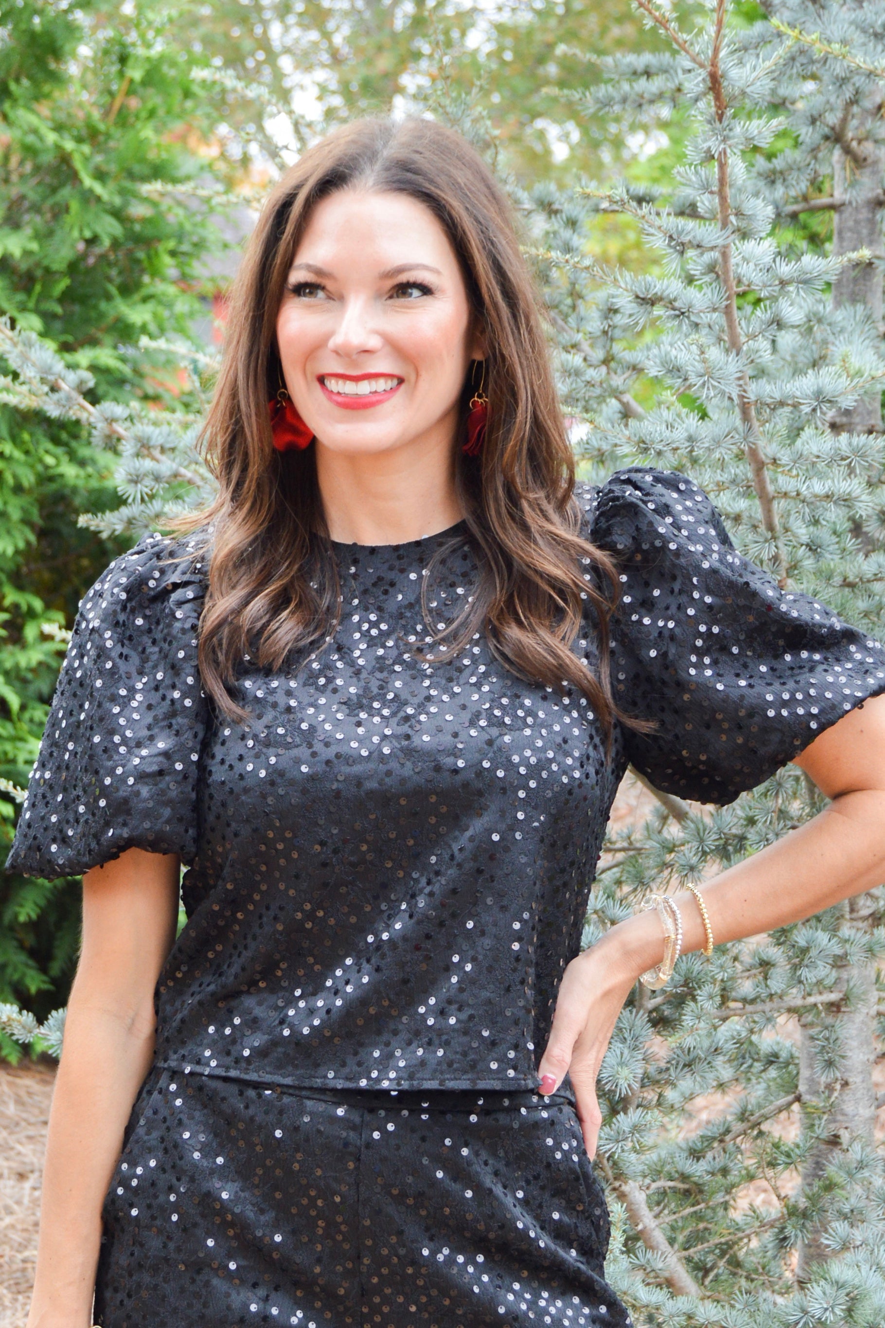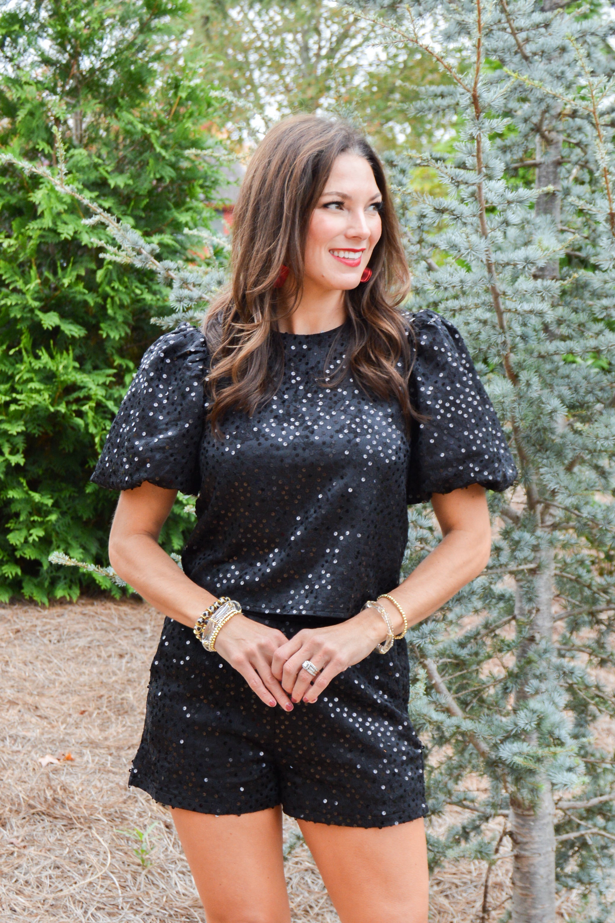 Get ready to sparkle and shine with our Blackout Bling Top! This statement piece features a sequin encrusted round neckline and trendy puff sleeves. The back keyhole with button closures adds a charming touch. Don't forget to complete the look with our matching shorts (sold separately).