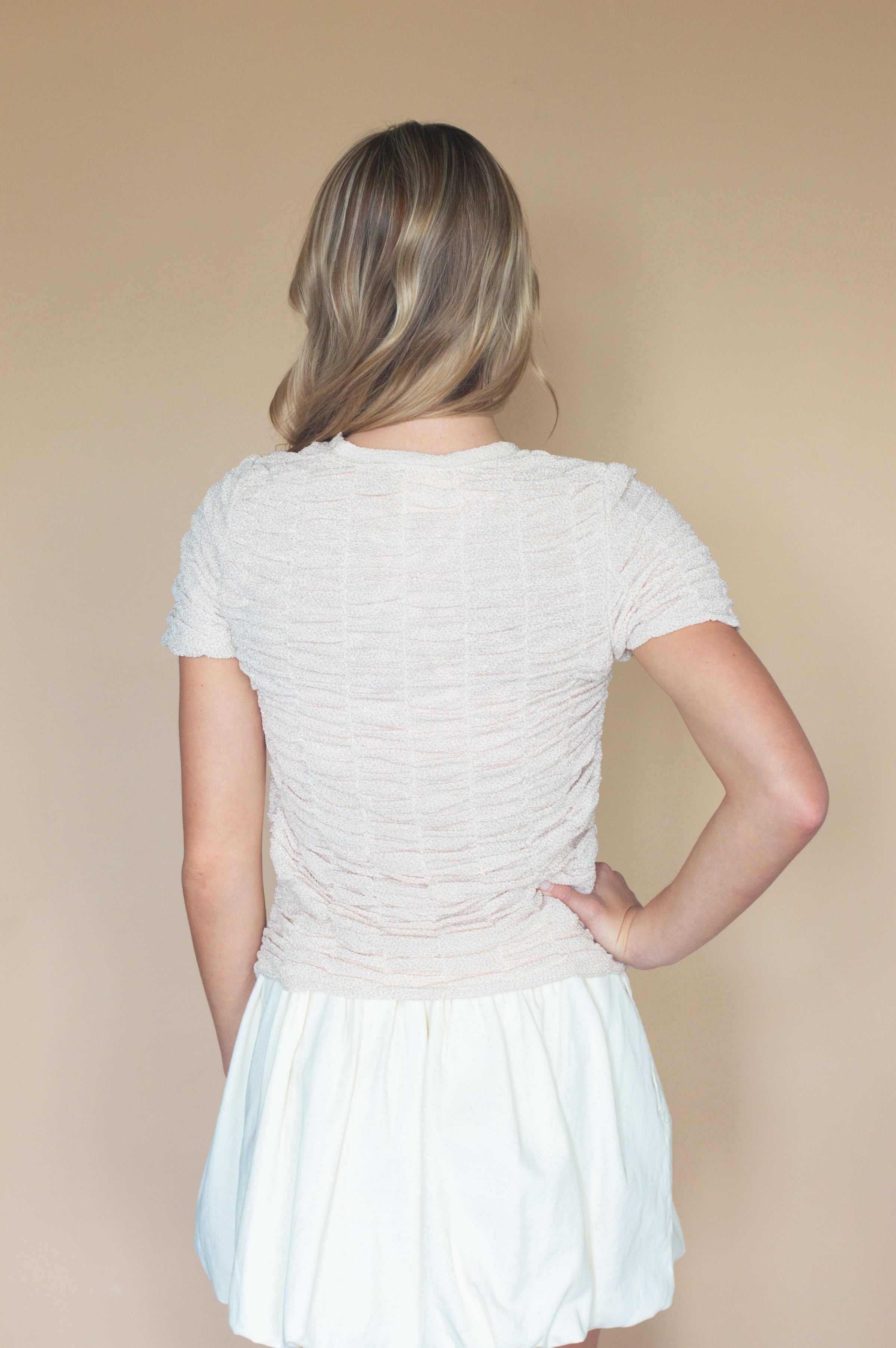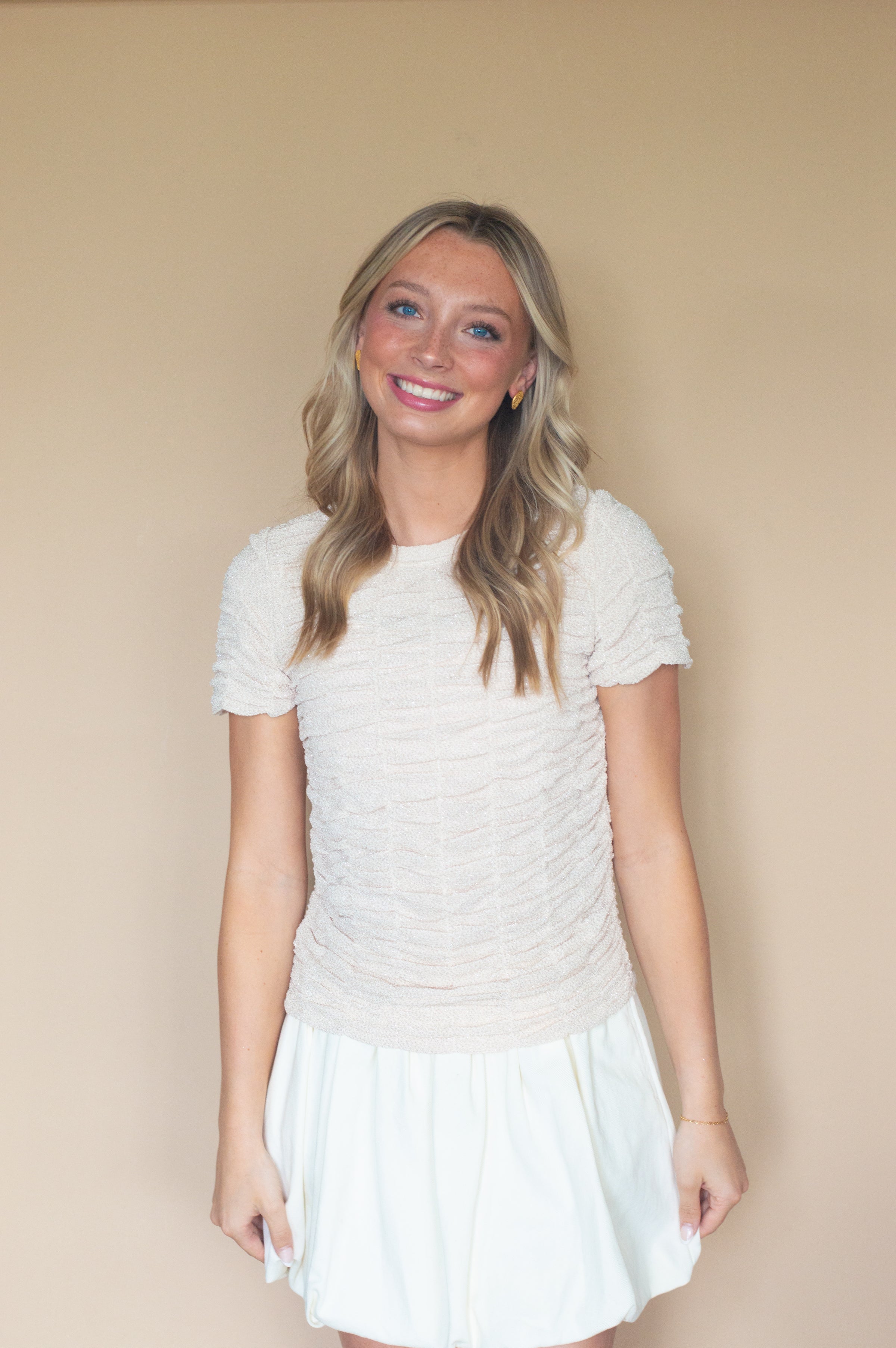 Effortlessly elevate your style with our Champagne Chic Ruched Top. With a round neckline and metallic ruched detailing, this top is both comfortable and stylish. The super stretchy material makes it perfect for any occasion, whether it's a casual day out or dressing up for a special event.