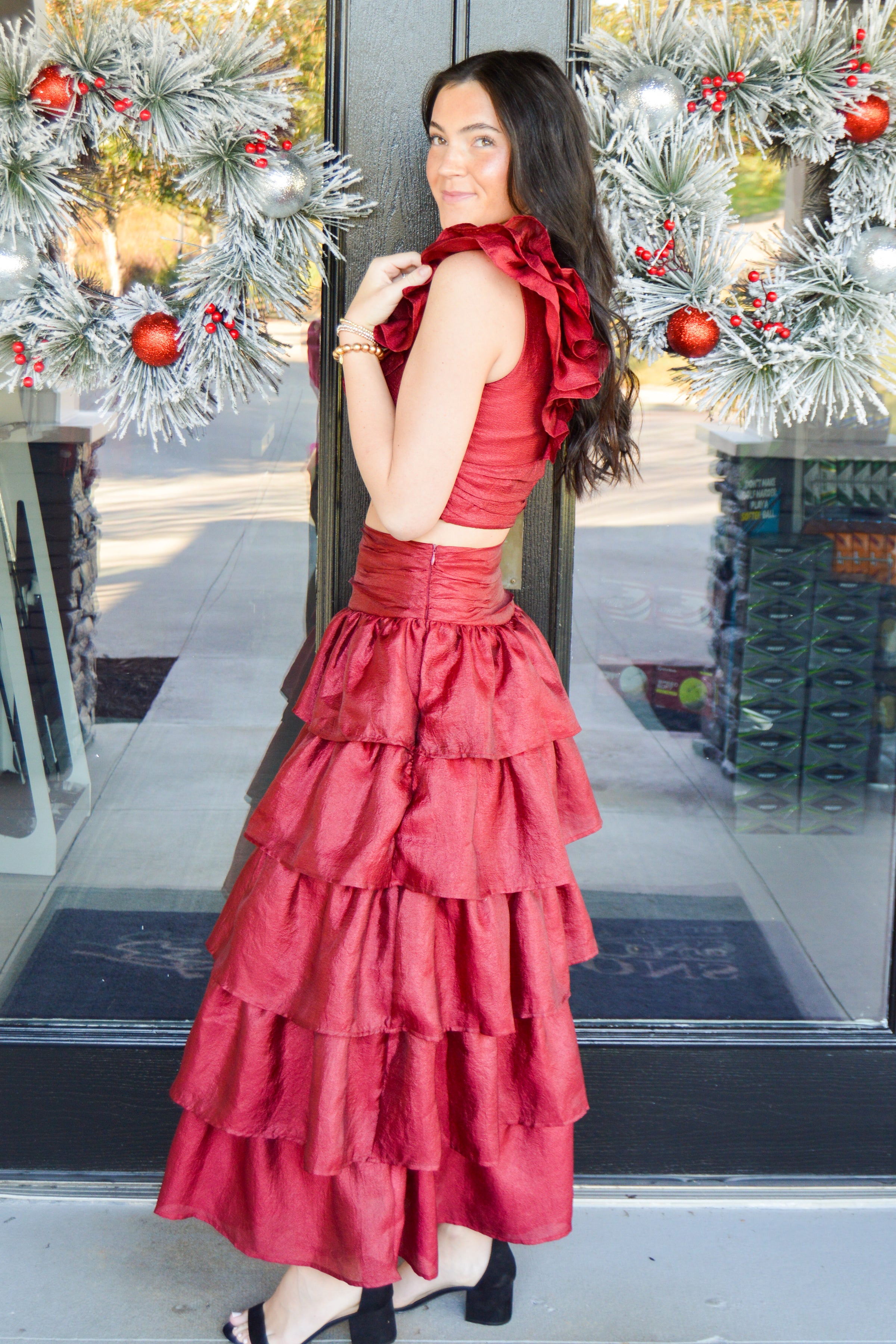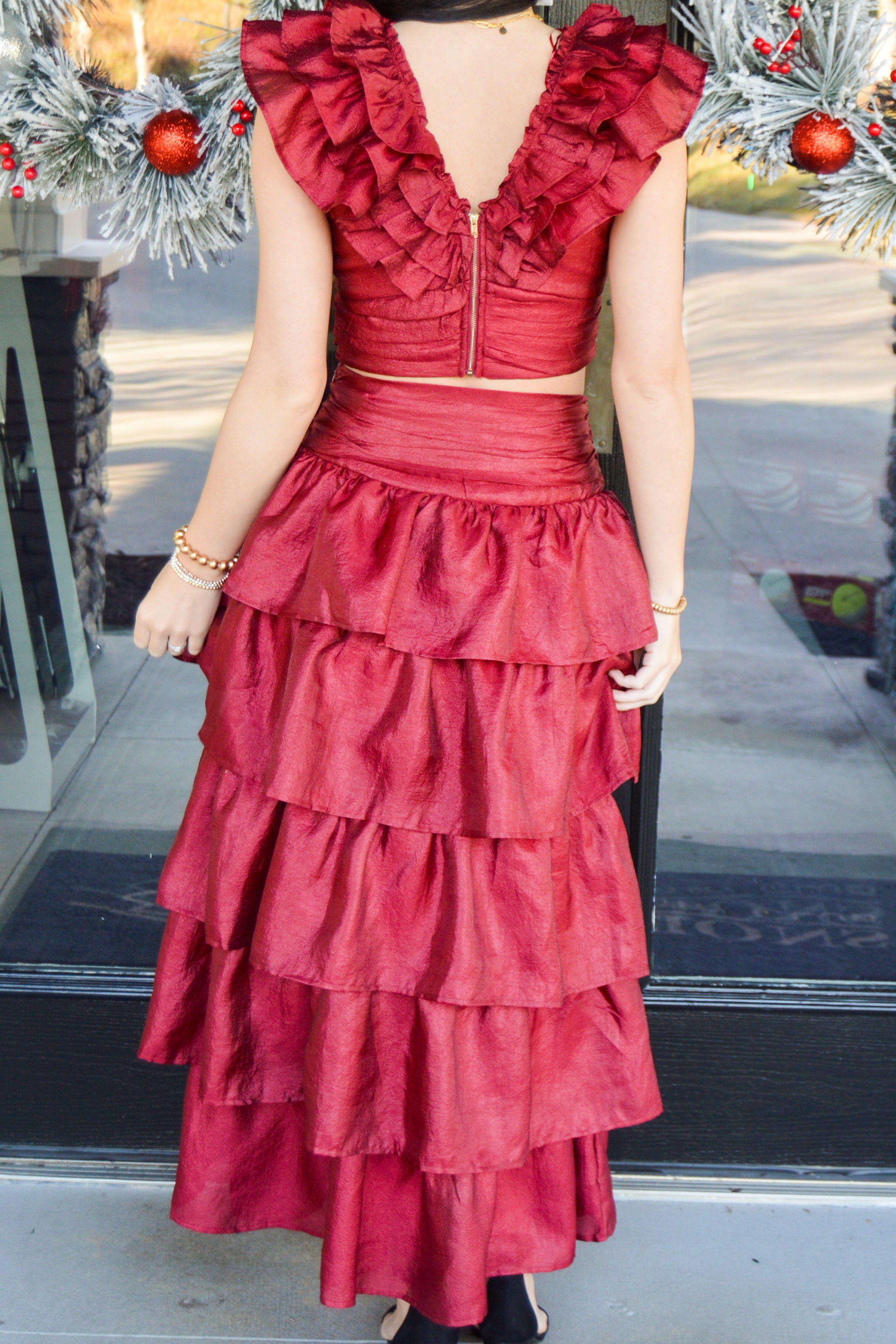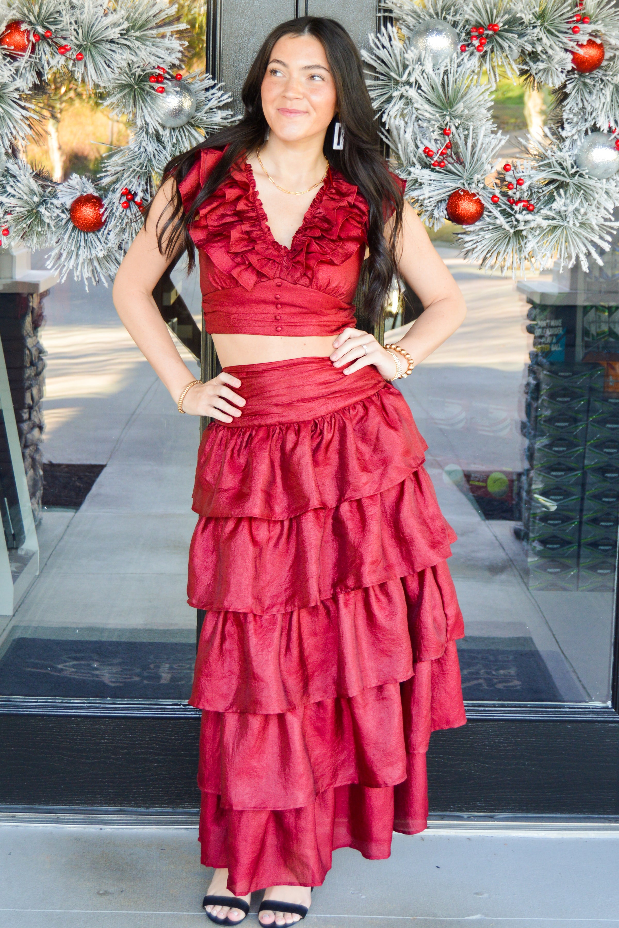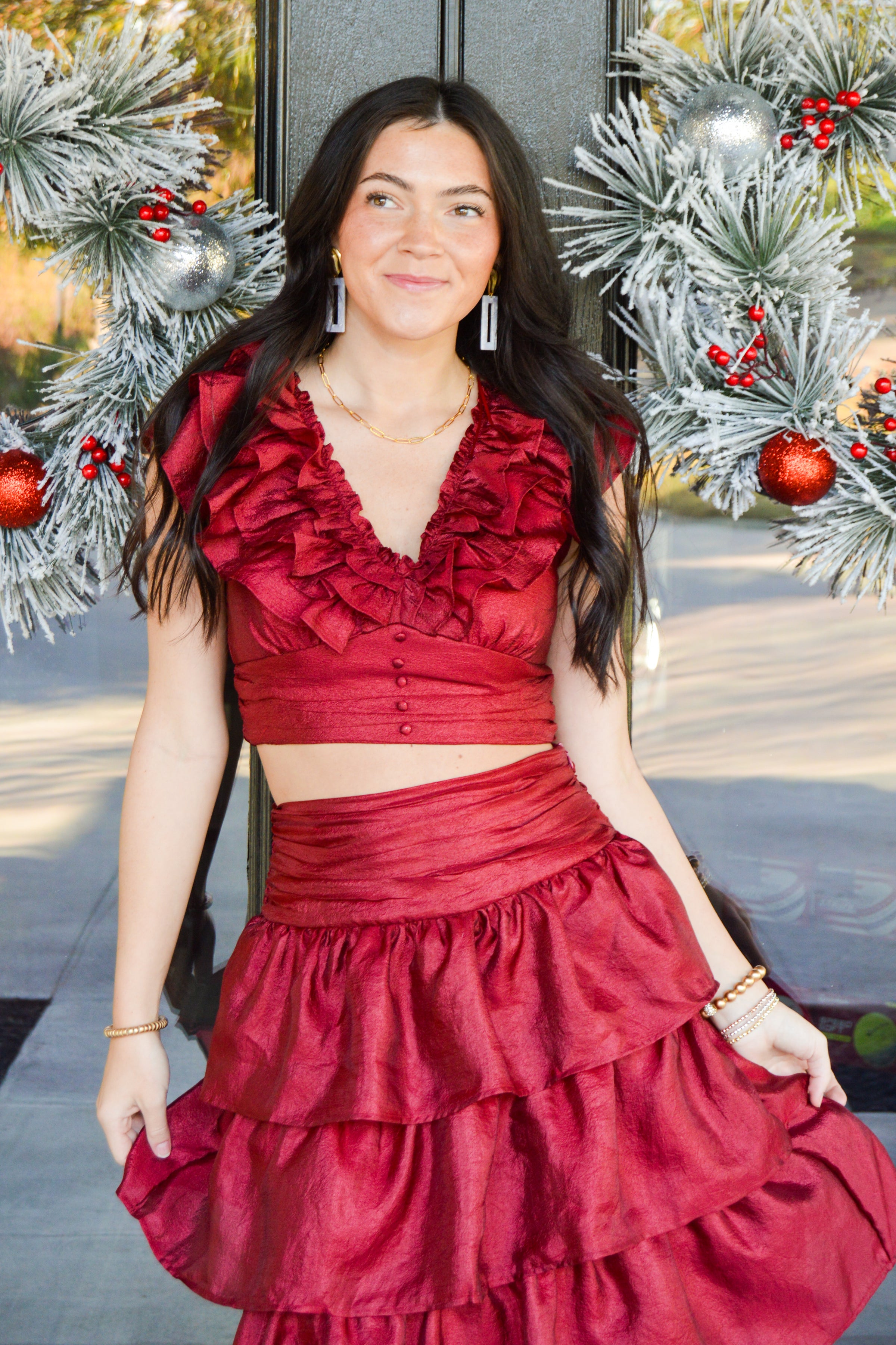 Get ready to ruffle some feathers in our Ruffled Romance Top. Made with a shiny fabric, this cropped top features a flattering V-shaped neckline and playful faux button accents. The ruffle detailing adds a touch of romance, while the back zipper closure keeps things easy. Complete the look with our matching skirt for a head-turning ensemble.