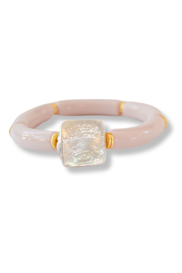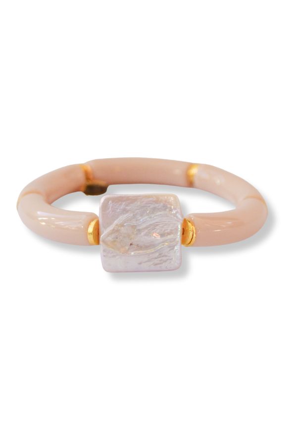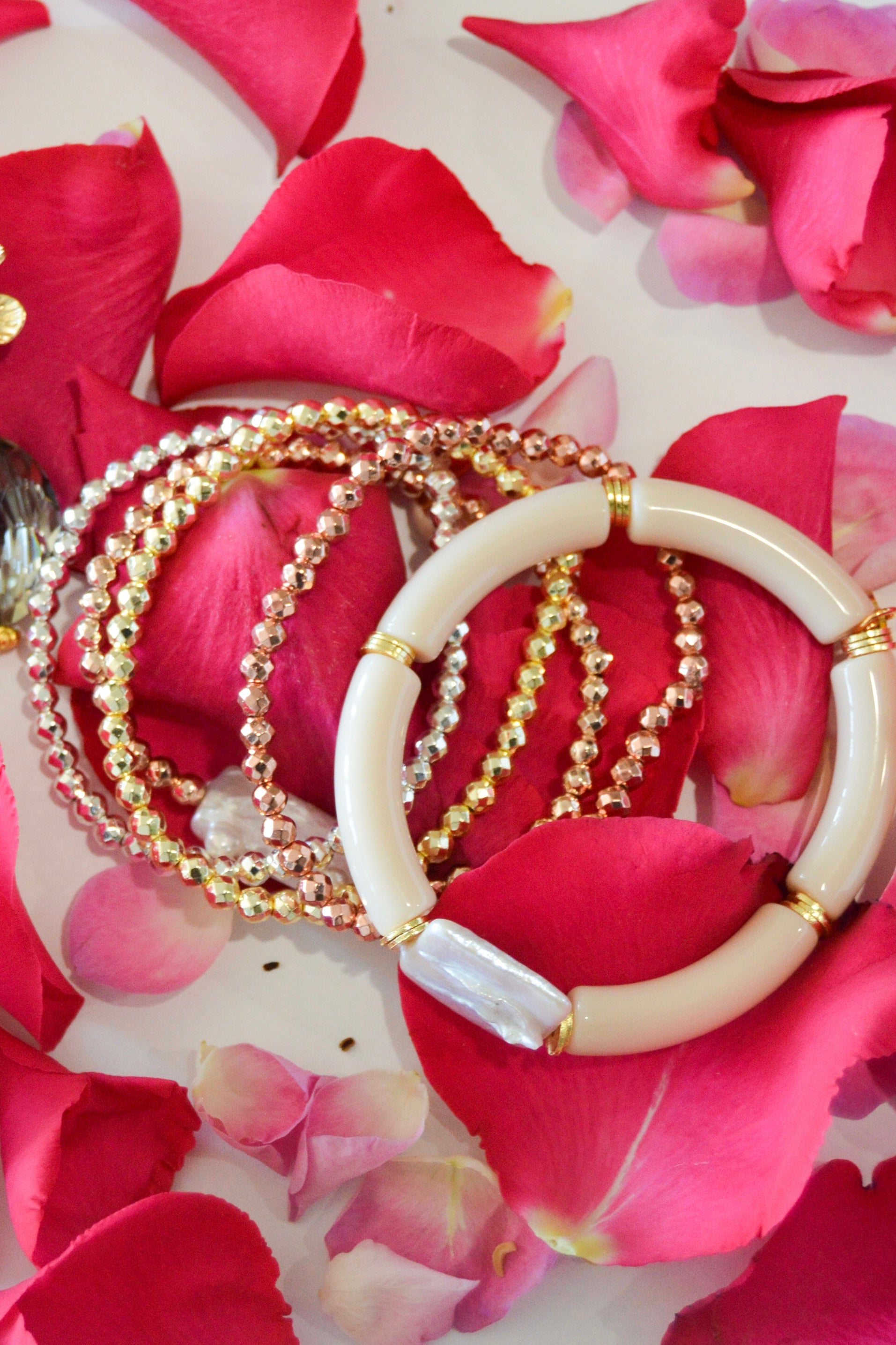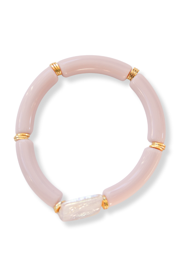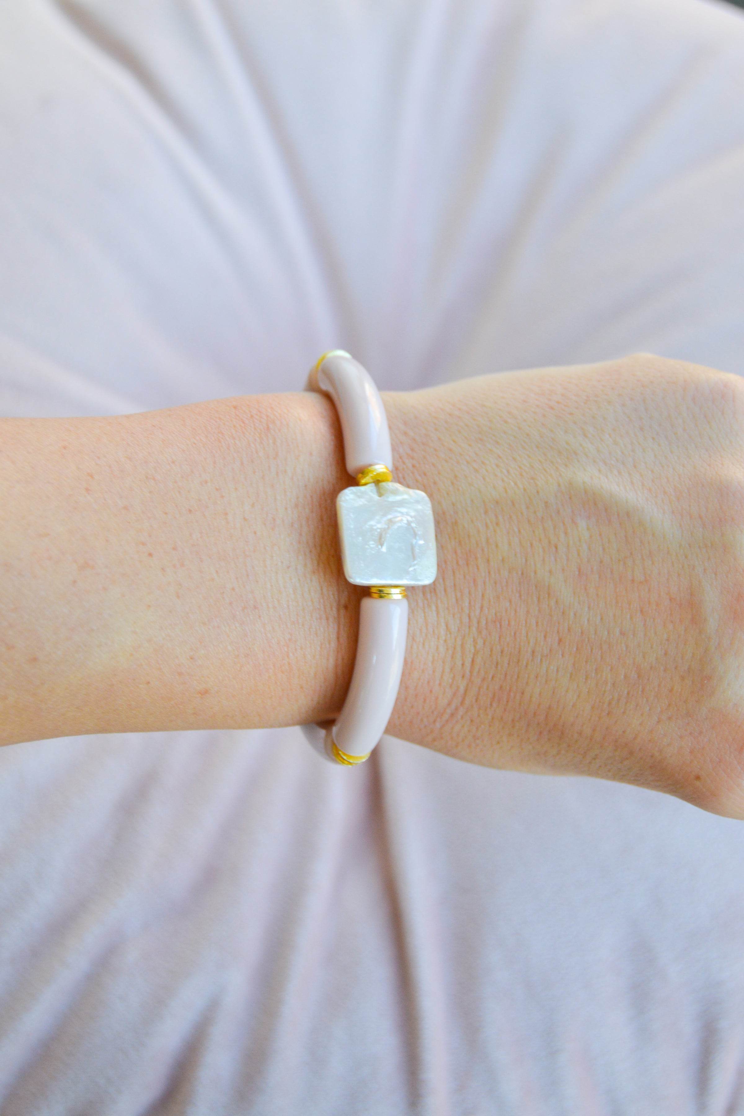 Get ready to elevate your bracelet game with our Tess Bracelet! Made with acrylic beads and gold spacers, this bracelet is adorned with a large freshwater pearl center, adding a touch of elegance to any stack. So go ahead, mix and match, and let your wrist do the talking!