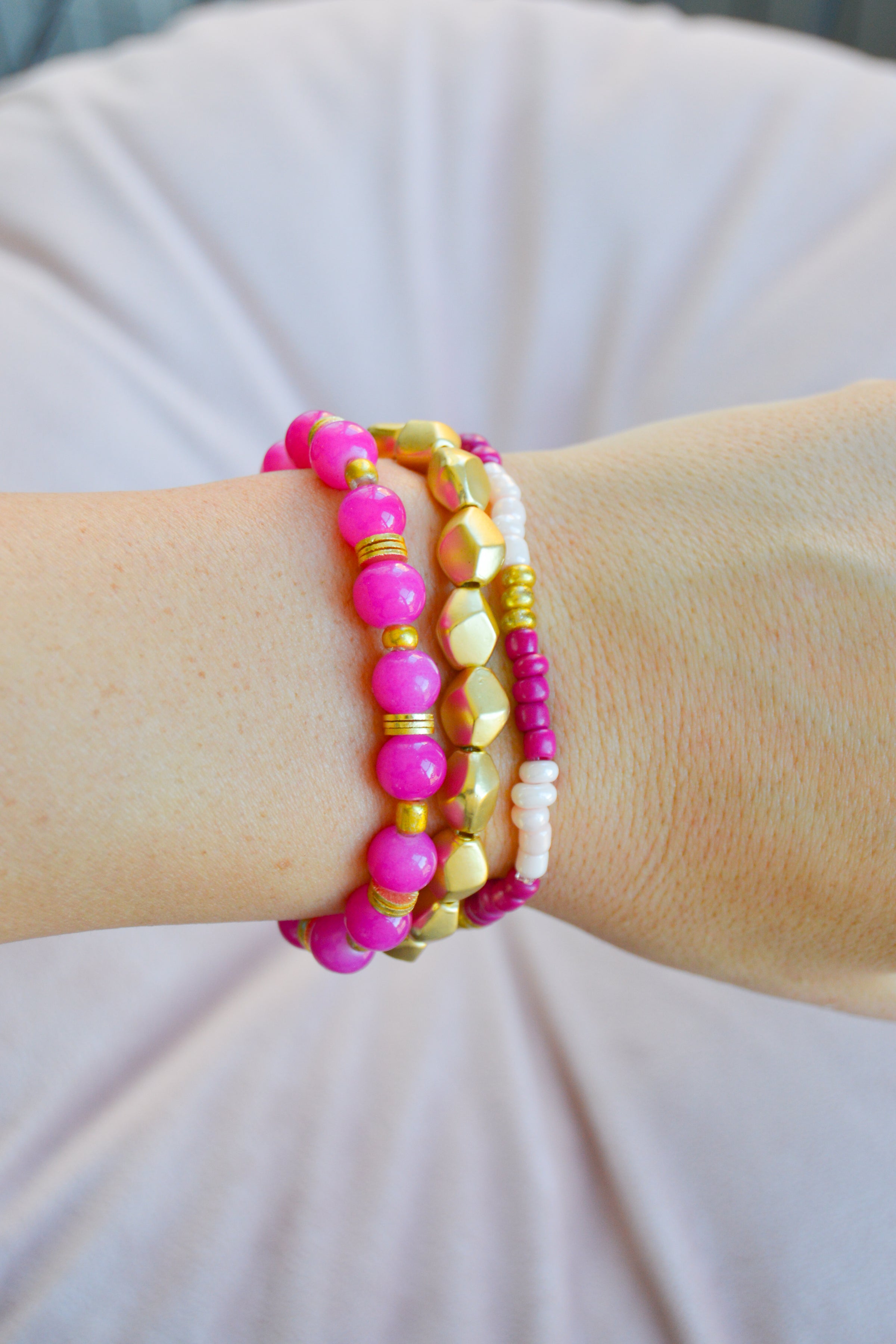 Unleash your inner fashionista with the Amaya Bracelet Stack. This stunning set features a luxurious Tibetan gold nugget bracelet, paired with delicate pink agate gemstone beads and a trendy seed bead bracelet. Whether worn individually or all together, this stack is sure to add a touch of sass to any outfit.