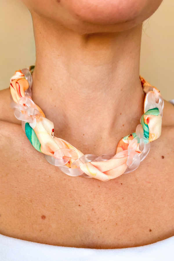 Meet your new favorite spring statement: the scarf necklace, reimagined. Featuring a frosted acrylic chain paired with the softest, dreamiest spring scarf, this piece is equal parts playful and polished. It’s lightweight, eye-catching, and guaranteed to add a pop of happy to every outfit—no styling effort required.