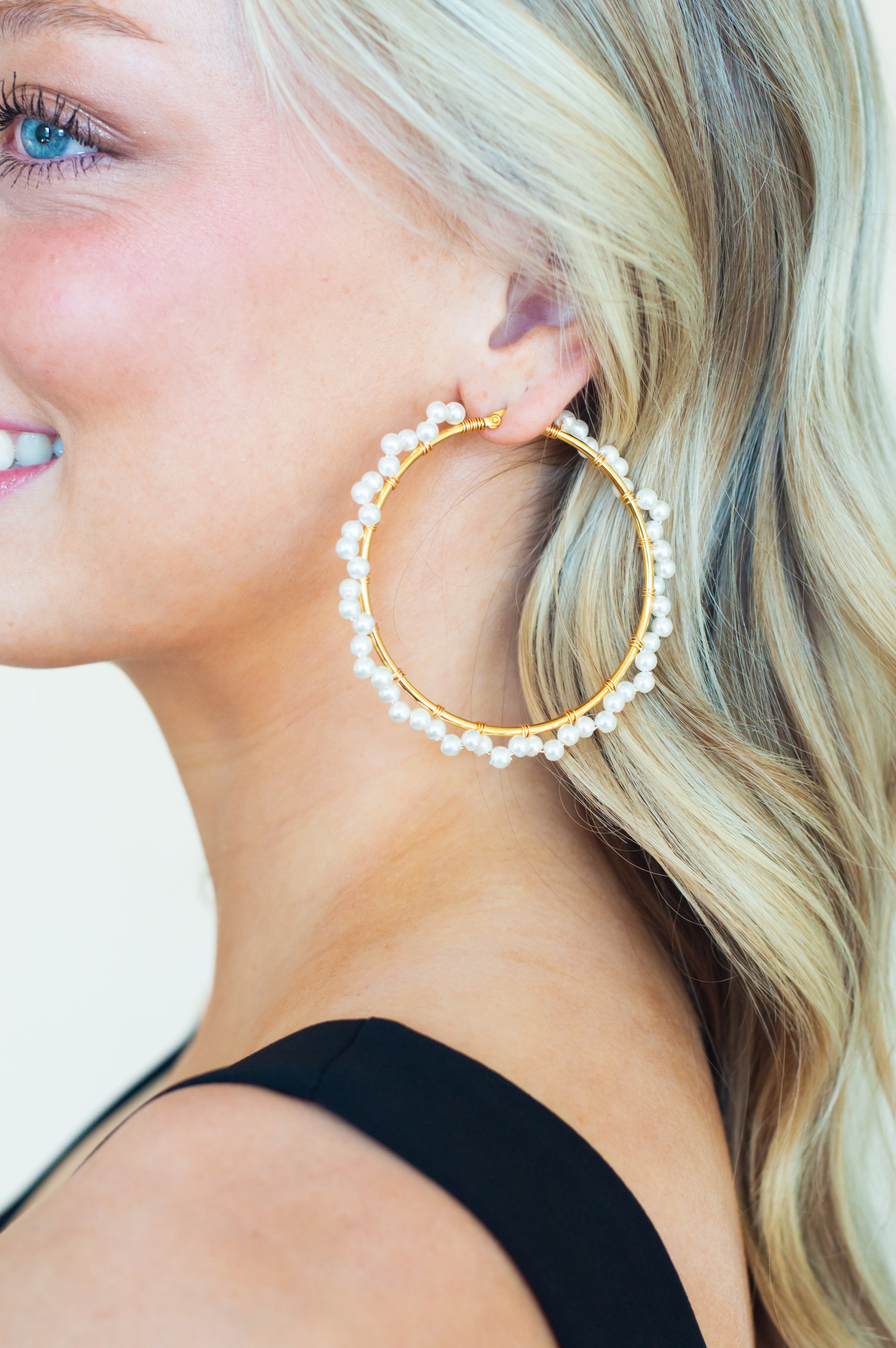 Discover the Teagan Hoop Earrings, featuring a 2.5" diameter design wrapped in luxurious freshwater pearls. These gold-plated hoops offer a perfect balance of elegance and modern style, making them ideal for both casual and formal occasions. With their unique design and high-quality creation, the Teagan Earrings are a versatile addition to any jewelry collection. Elevate your look today with these statement earrings!