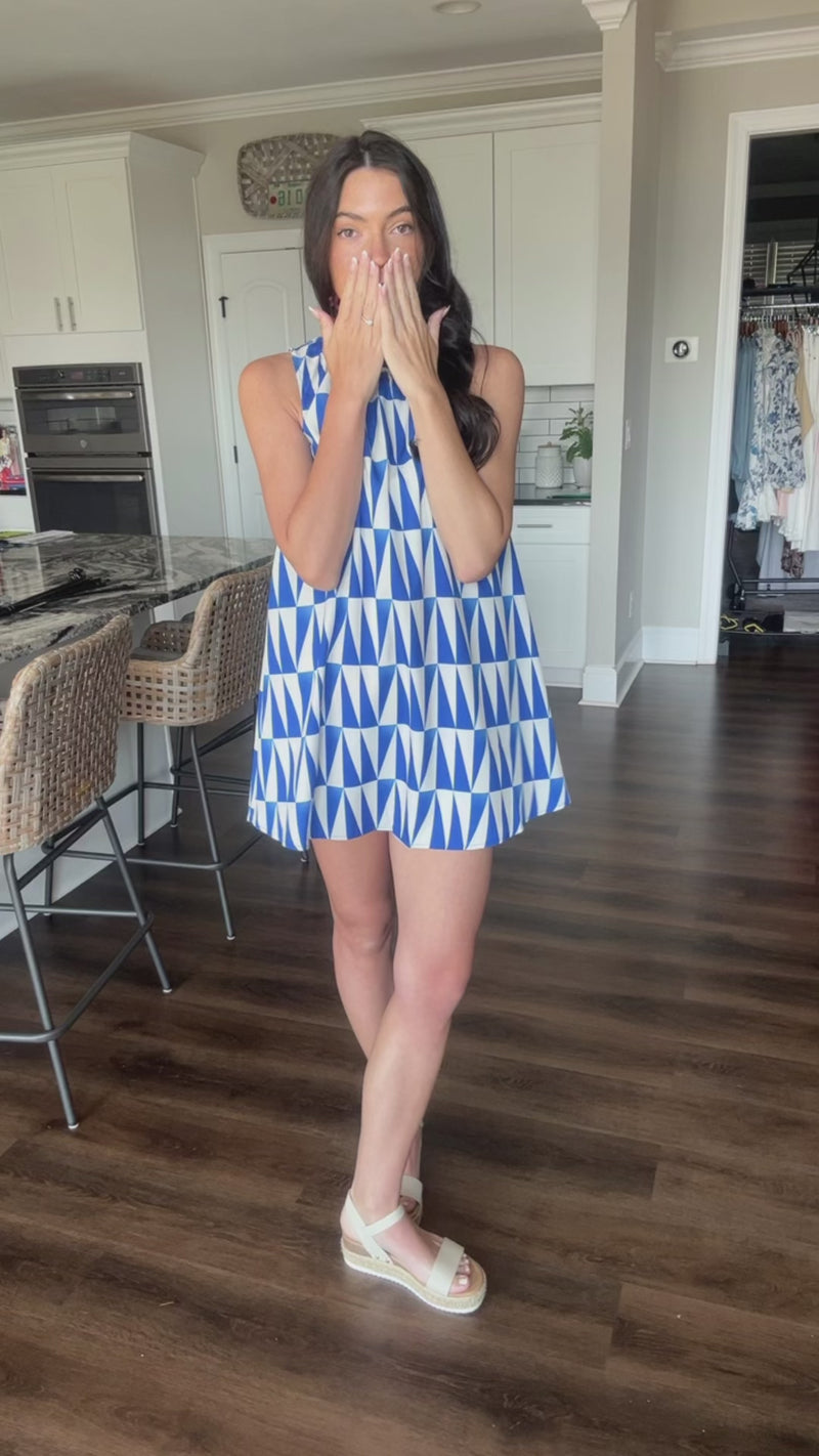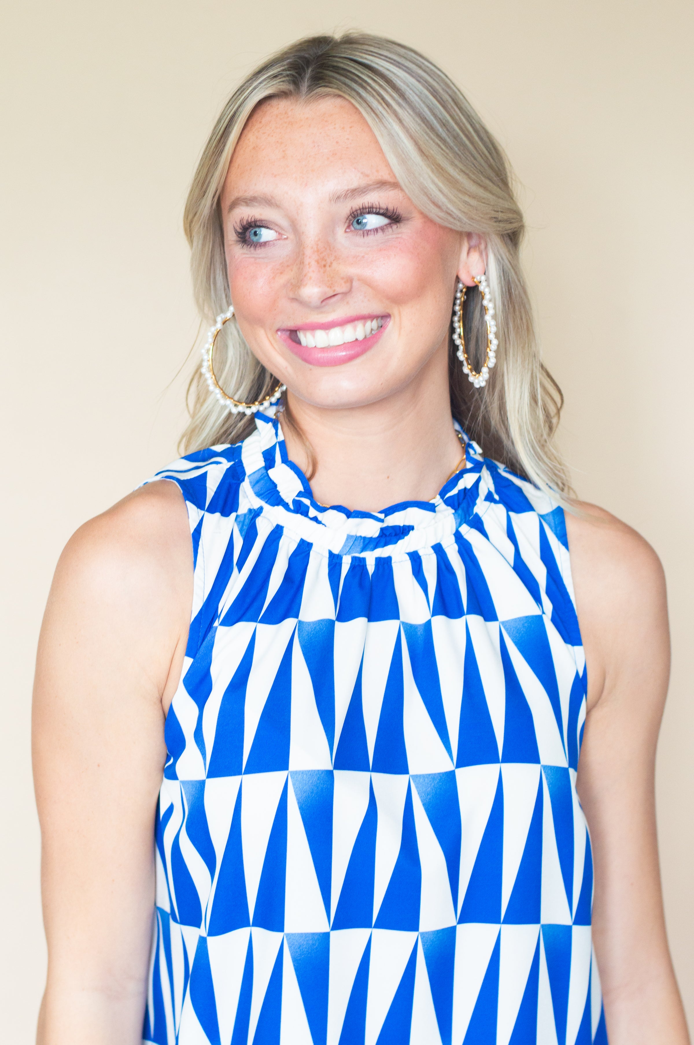 Celebrate in style with the All-American Ruffle Neck Dress — a festive favorite designed to turn heads from Fourth of July barbecues to spirited gamedays. This sleeveless stunner features a bold geometric print in a vibrant patriotic blue, perfect for showing off your stars-and-stripes spirit.