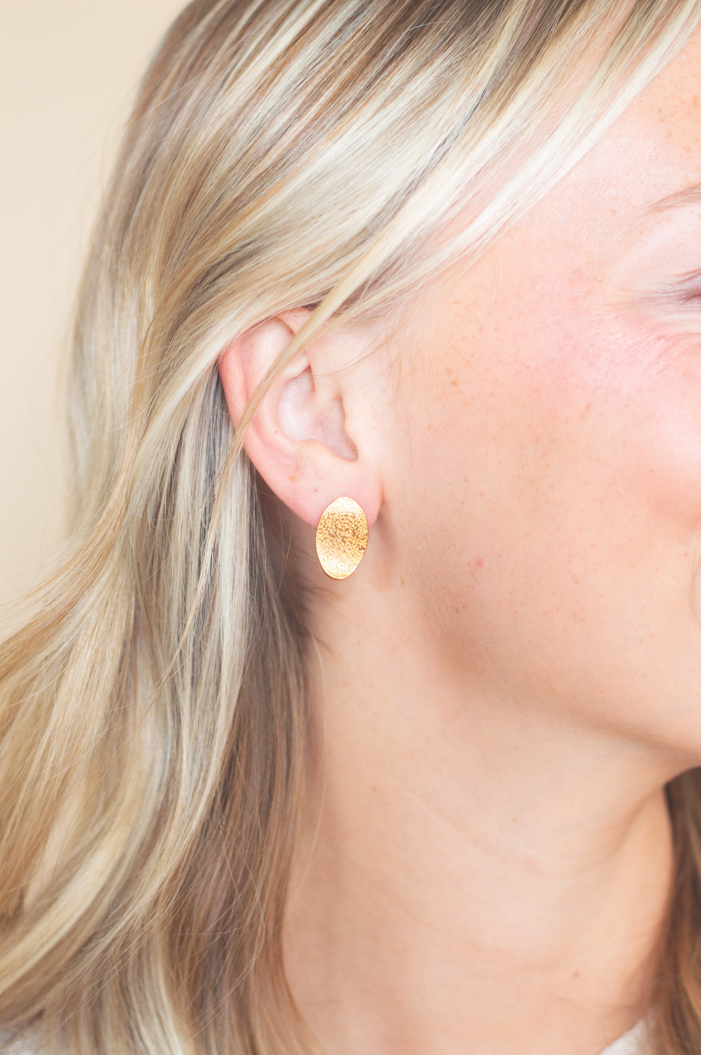These Braelyn Stud Earrings feature a signature gold textured oval stud, making them a chic and stylish addition to any outfit. Crafted from nickel and lead-free materials, they are lightweight and comfortable to wear. The perfect choice for fashion-forward individuals looking to make a simple statement.