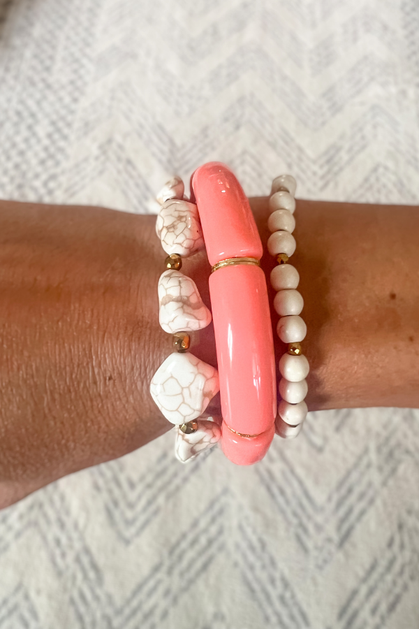 Elevate your wrist game with the Eliana Bracelet Stack. Featuring the best selling Drew Bracelet and two cream howlite bead bracelets, this stack offers a chic and versatile addition to any outfit. With three bracelets included, you'll have endless styling options for a polished and on-trend look.