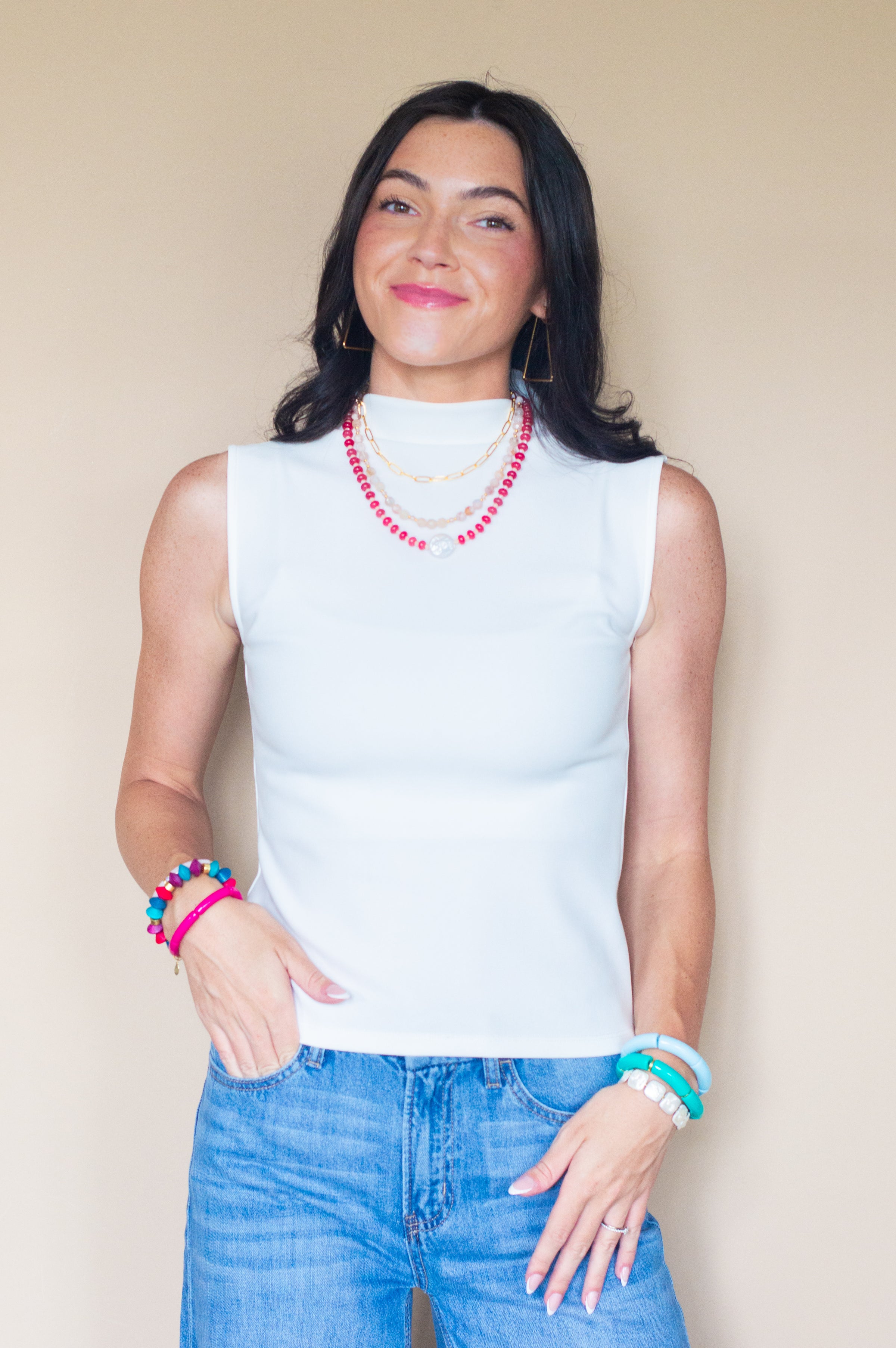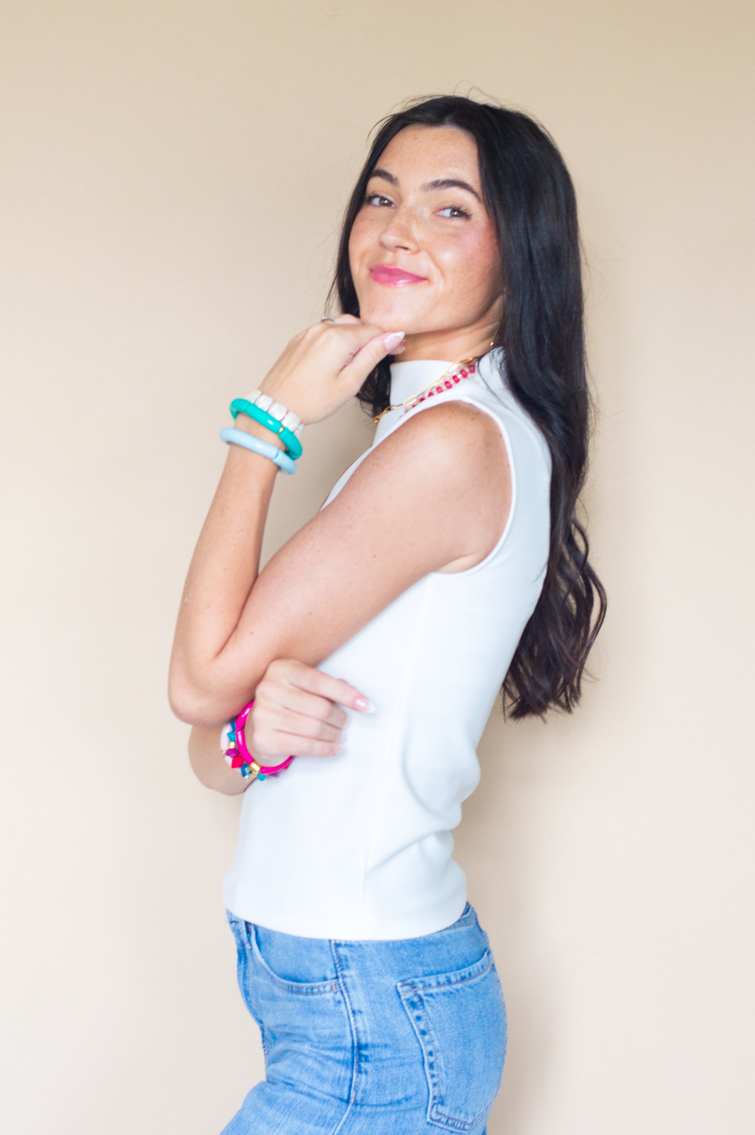 The High Society Sleeveless Top is your wardrobe’s answer to chic versatility. Designed in crisp white with a structured high collar and clean, sleeveless silhouette, this top brings instant polish whether you're headed to the office or out for cocktails.